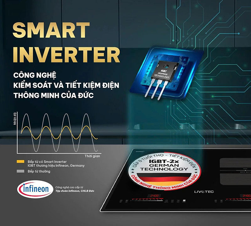 Hai bộ IGBT hoạt động đồng thời hoặc luân phiên, giúp bếp đạt công suất cao nhất chỉ sau vài giây nhưng vẫn tiết kiệm điện năng khi cần.