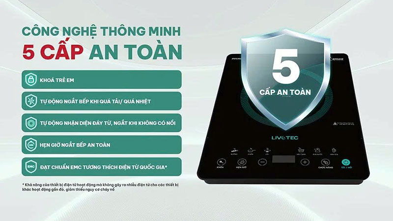 Sản phẩm tích hợp loạt tính năng an toàn như: khóa trẻ em, tự ngắt khi quá tải hoặc quá nhiệt, nhận diện đáy nồi, ngắt khi không có nồi, hẹn giờ tắt bếp. Đặc biệt, đạt chuẩn EMC không gây nhiễu đến các thiết bị điện tử khác.