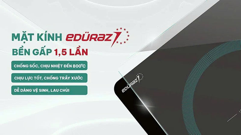 Mặt kính nguyên khối Eduraz có khả năng chịu nhiệt lên đến 800°C, chống trầy xước, chịu lực tốt và dễ vệ sinh. Đây là lựa chọn hoàn hảo cho không gian bếp hiện đại.