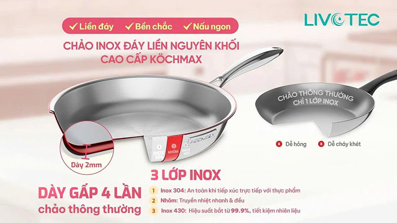 ♦ Chảo inox 3 lớp nguyên khối, dày 2mm – truyền nhiệt nhanh, bền gấp 4 lần