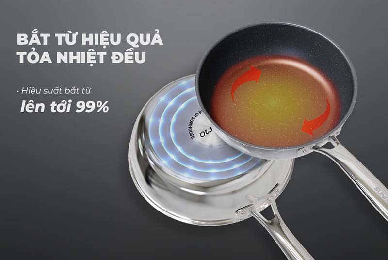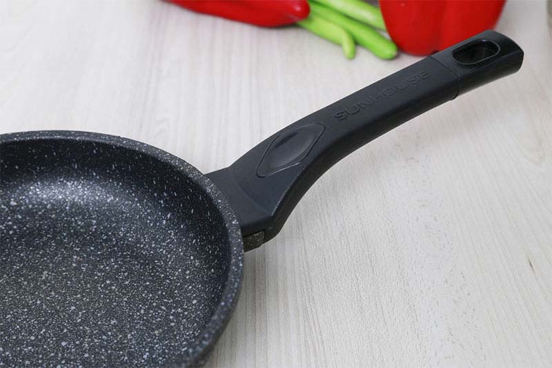 Bề mặt chảo Sunhouse này bằng lớp chống dính đá hoa cương phủ sơn Whitford chịu nhiệt tối đa 315 oC
