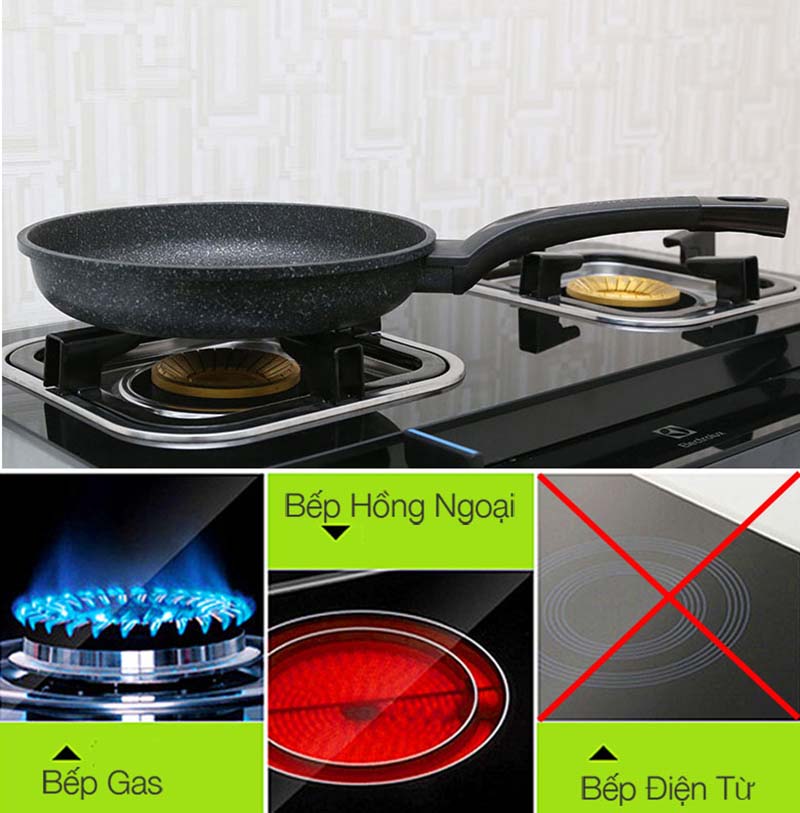 Chảo sử dụng được cho bếp gas, bếp hồng ngoại, không sử dụng được cho bếp từ