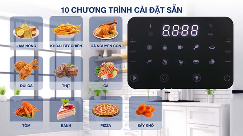 - Sản phẩm có 10 chương trình cài đặt sẵn, bao gồm: làm nóng nồi, khoai tây chiên, gà nguyên con, đùi gà, thịt, cá, tôm, pizza, bánh, sấy khô thực phẩm.