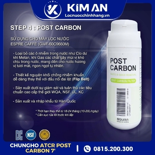 Lõi lọc ChungHo ATCR Post Carbon 7 inch là lõi lọc số 3 quan trọng trong hệ thống máy lọc nước ESPRE CAFFE, giúp hoàn thiện chất lượng nước trước khi sử dụng. Sử dụng than hoạt tính thương hiệu số 1 thế giới Calgon – Mỹ, lõi lọc này giúp khử mùi, loại bỏ clo dư, mang đến hương vị nước tinh khiết, ngon ngọt và tươi mát.