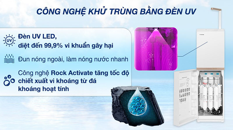 | Tính năng diệt khuẩn | Đèn UV LED trong bình chứa – diệt khuẩn 99.9% |