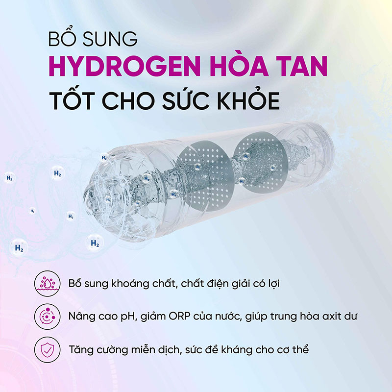 Lõi ORP Hydrogen tạo ra nước giàu hydrogen, có khả năng trung hòa gốc tự do, giúp tăng đề kháng, hỗ trợ chống oxy hóa và làm chậm quá trình lão hóa. Đây là điểm nổi bật mà nhiều máy lọc phổ thông không sở hữu.