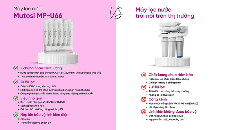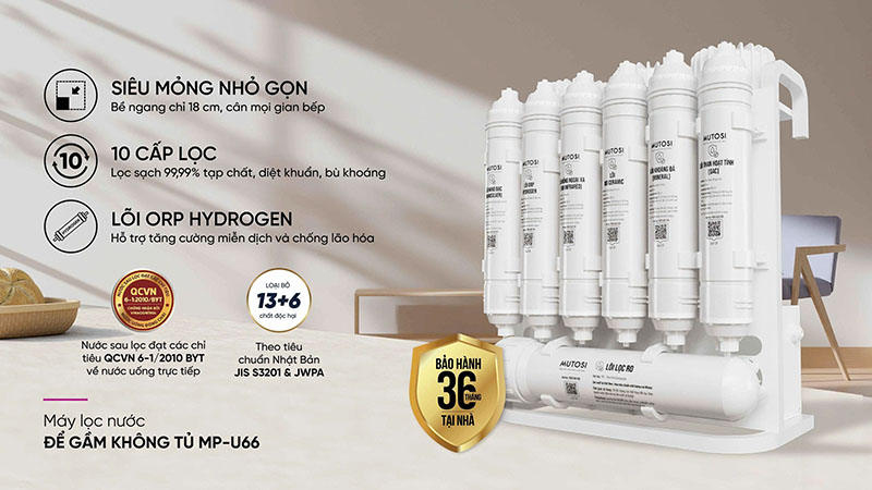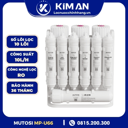 Máy lọc nước để gầm Mutosi MP-U66 là lựa chọn hoàn hảo cho những không gian bếp hiện đại nhờ thiết kế nhỏ gọn, tiết kiệm diện tích nhưng vẫn sở hữu hệ thống lọc mạnh mẽ 10 cấp. Với công suất lọc 10L/h, màng RO tiêu chuẩn và lõi chức năng bổ sung khoáng – Hydrogen, MP-U66 mang đến nguồn nước sạch tinh khiết, an toàn đạt chuẩn QCVN 6-1:2010/BYT và tiêu chuẩn chất lượng Nhật Bản.