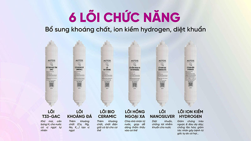 – 6 lõi chức năng: Than hoạt tính, khoáng đá, Bioceramic, hồng ngoại xa, Nano bạc, Hydrogen bổ sung khoáng, tăng vị nước, tăng pH và hydrogen.