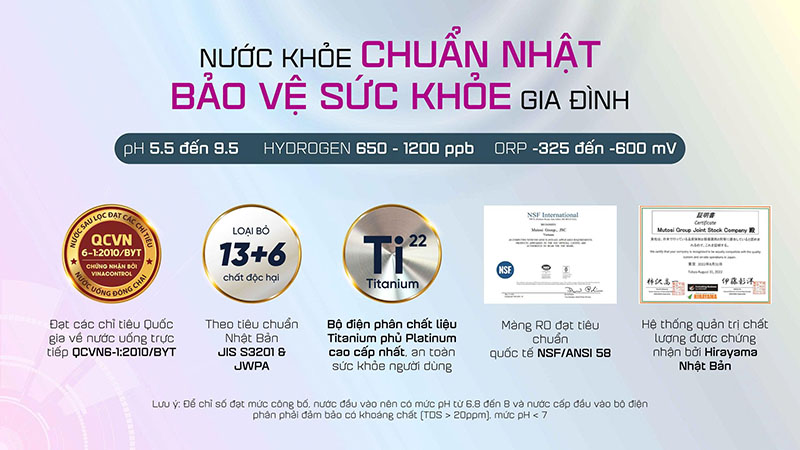 | Chỉ số nước ion kiềm | pH 8.5 – 9.5, Hydrogen 650 – 1200 ppb, ORP -325 đến -600mV |