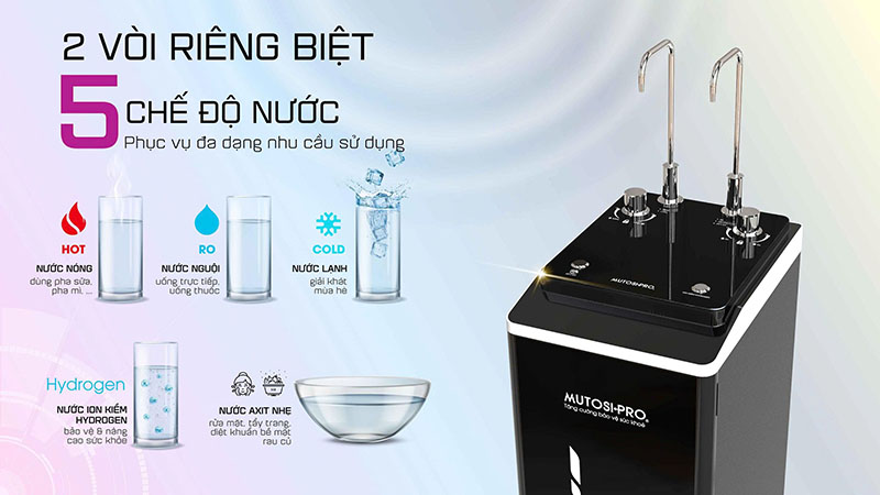 | Số loại nước | 5 loại: Nóng – Lạnh – RO – Ion Kiềm – Axit nhẹ |