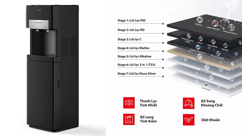| Số lõi lọc | 7 lõi lọc (PAC, RO, Post C, Maifan, Alkaline, T33 3in1, Nano Silver) |