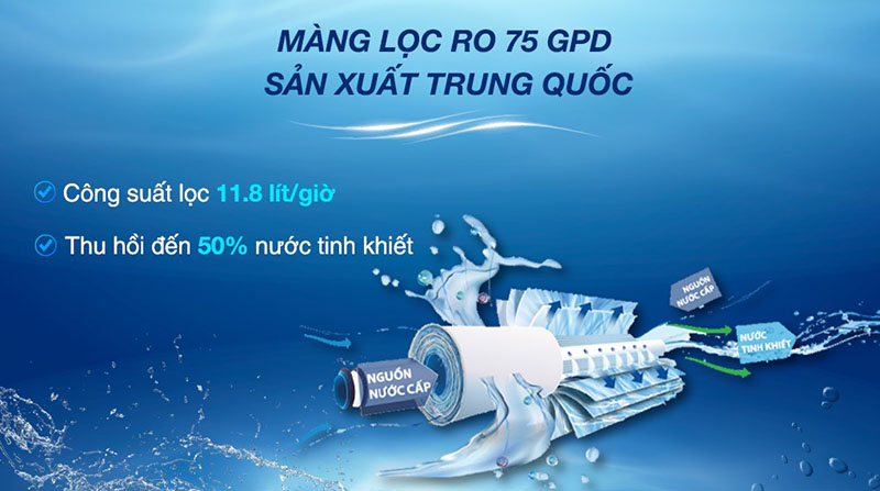 Hiệu suất lọc đạt 11.8 lít/giờ, tỷ lệ thu hồi nước tinh khiết lên tới 50%, giúp tiết kiệm nước và chi phí vận hành.