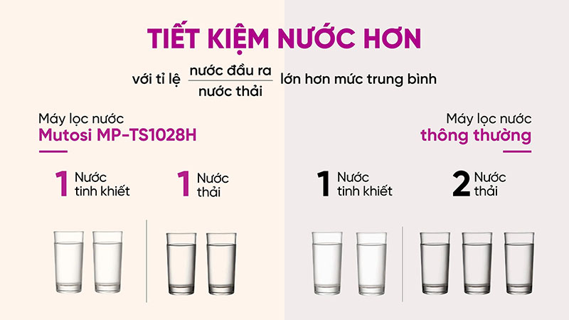 Giảm lãng phí, tiết kiệm nước vượt trội hơn nhiều dòng máy RO thông thường (chỉ 30:70).