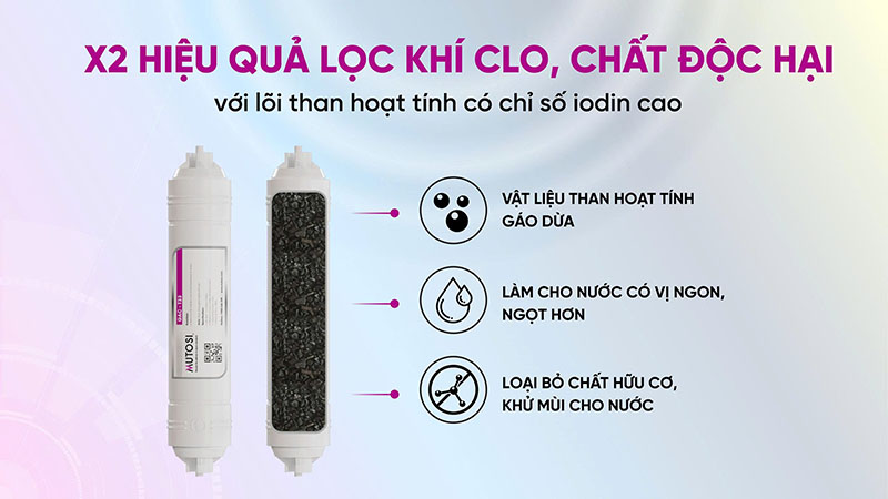 Đặc biệt, lõi Hydrogen Ion Kiềm sản xuất tại Hàn Quốc cho nước pH 8.5–9.5, ORP –400 đến –600 mV và hydrogen cao từ 800–1200 ppb.