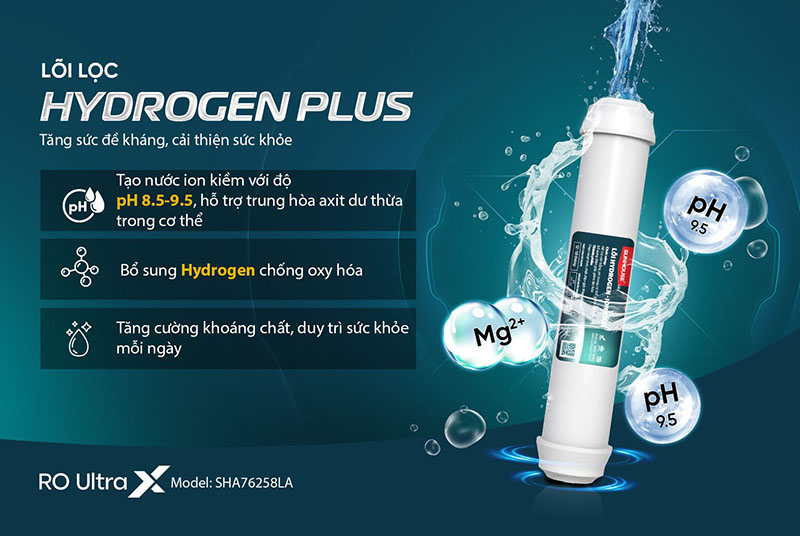 - Hydrogen Plus: tạo nước kiềm, bổ sung hydrogen chống oxy hóa, tăng pH, trung hòa axit dư.