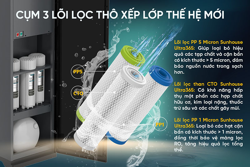 1. Cấp lọc thô – bộ 3 lõi xếp lớp tăng gấp đôi tuổi thọ (12 tháng)