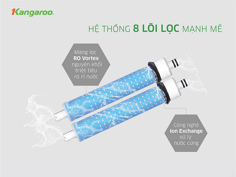 Kangaroo Hydrogen Slim Duo 2 KG100HD2 được trang bị hệ thống 8 lõi lọc mạnh mẽ, đảm bảo loại bỏ đến 99,99% vi khuẩn, virus và chất độc hại, đồng thời bổ sung Hydrogen và khoáng chất cần thiết: