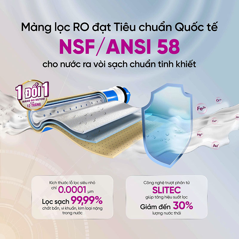 – Lõi RO Mutosi SLITEC 75GPD (lõi 5) với công nghệ thẩm thấu ngược tiên tiến loại bỏ đến 99,99% vi khuẩn, kim loại nặng, virus và các độc tố có trong nước máy đô thị.