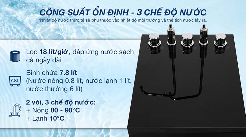 - Công suất lọc: 18 lít/giờ, đáp ứng tốt nhu cầu sử dụng cả ngày