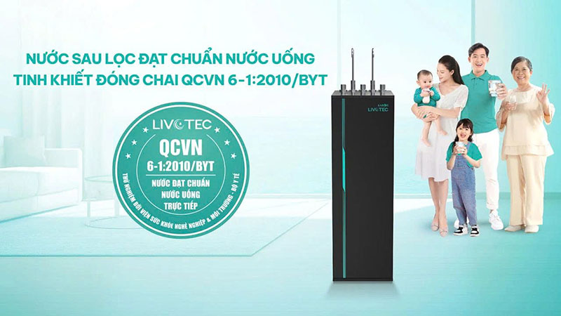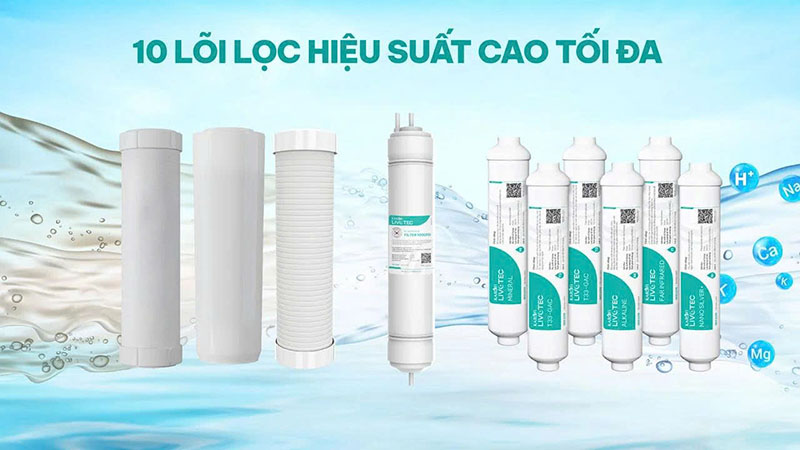| Hệ thống lọc | Hệ thống lọc 10 lõi lọc công nghệ cao: cụm 3 lõi lọc thô Livotec, màng RO và 6 lõi chức năng thay nhanh |