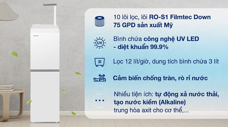 Với kiểu dáng hiện đại, máy lọc nước Toshiba mang lại sự tiện lợi và thẩm mỹ cho mọi không gian sống.