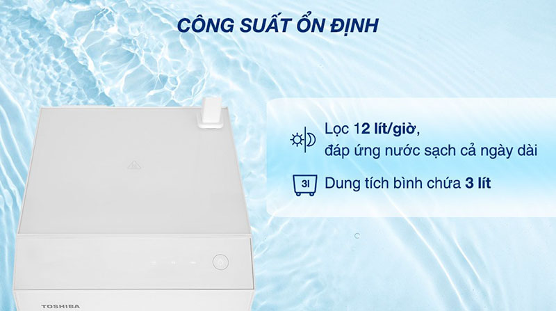 Công suất lọc 12 lít/giờ, bình chứa nước 3 lít – đủ cho cả gia đình sử dụng hàng ngày.