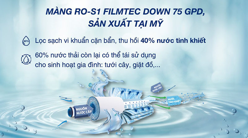 | Công nghệ màng lọc RO | RO-S1 Filmtec Down 75 GPD – Sản xuất tại Mỹ |