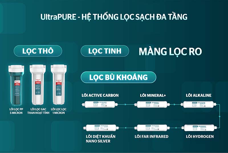 Công nghệ UltraPURE bù khoáng với 6 lõi lọc đủ các công năng khác nhau, giúp cung cấp vừa đủ lượng vi khoáng cần thiết cho cơ thể và tạo vị ngọt tự nhiên cho nước. Không chỉ lọc nước sạch, lõi lọc Hydrogen còn bổ sung Hydrogen cho nước, có tác dụng chống lão hóa.