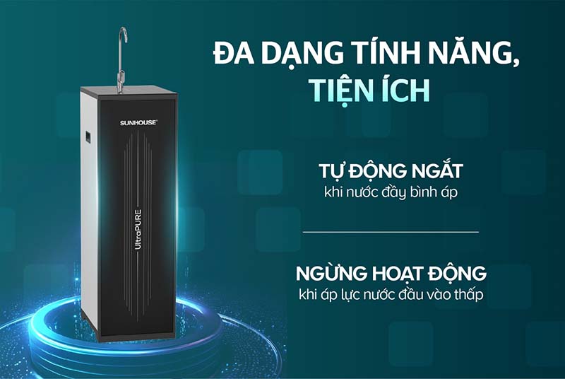 Máy lọc nước RO UltraPURE SUNHOUSE 10 lõi SHA8692K khả năng tự động ngắt khi nước đầy bình áp, ngừng hoạt động khi áp suất nước đầu vào thấp, tự động xả nước thải ra bên ngoài. Sản phẩm được bảo hành 1 năm trên toàn quốc.