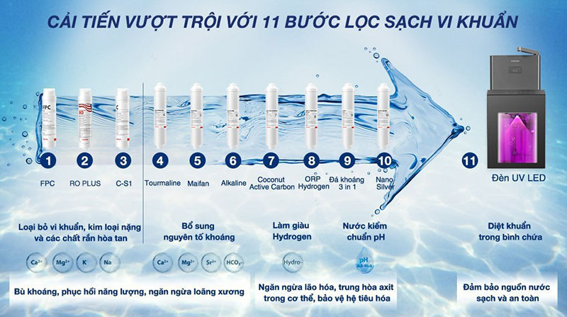 Hệ thống 11 bước lọc bao gồm các lõi: FPC, RO PLUS, C-S1, Tourmaline, Maifan, Alkaline, ORP Hydrogen, Coconut Active Carbon, Đá khoáng 3 in 1, Nano Silver và đèn UV LED khử khuẩn bình chứa giúp: